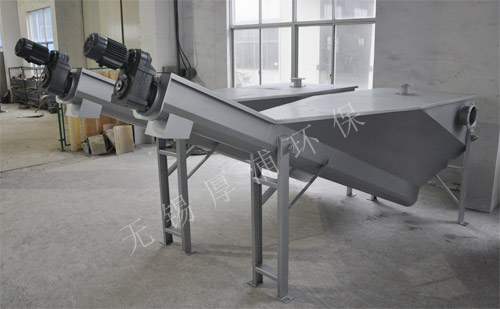 砂水分離器設(shè)備一般螺旋傾角為25~30°之間,砂水混合液從進(jìn)水管進(jìn)入本設(shè)備,混合液通過分離機(jī)上部的聚集箱,在水流的作用下,使混合液的砂粒與有機(jī)物進(jìn)行分離,砂水進(jìn)入集砂槽中,比重較大的顆粒(如砂粒)由于自重而下降,沉積于螺旋槽底部,在螺旋葉片的推動下,物料沿斜置的U型槽底部提升,離開液面后,繼續(xù)上移一段距離,砂粒中的水分逐漸在螺旋槽葉片的空隙中流回水箱,砂粒液逐漸干化到出料口處,依靠自重落入其他輸送裝置中,上清液則不斷從排水堰溢流出去,有機(jī)物在水流漩渦的作用下,也跟著上清液從溢流槽流出,回流至污水井中,從而達(dá)到砂水分離的作用。