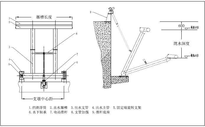 XB旋轉式潷水器是排出SBR反應池中上清液的專用設備。旋轉式潷水器通過電動推桿的驅動,潷水堰槽繞排水管,實現潷水器連續排水。
